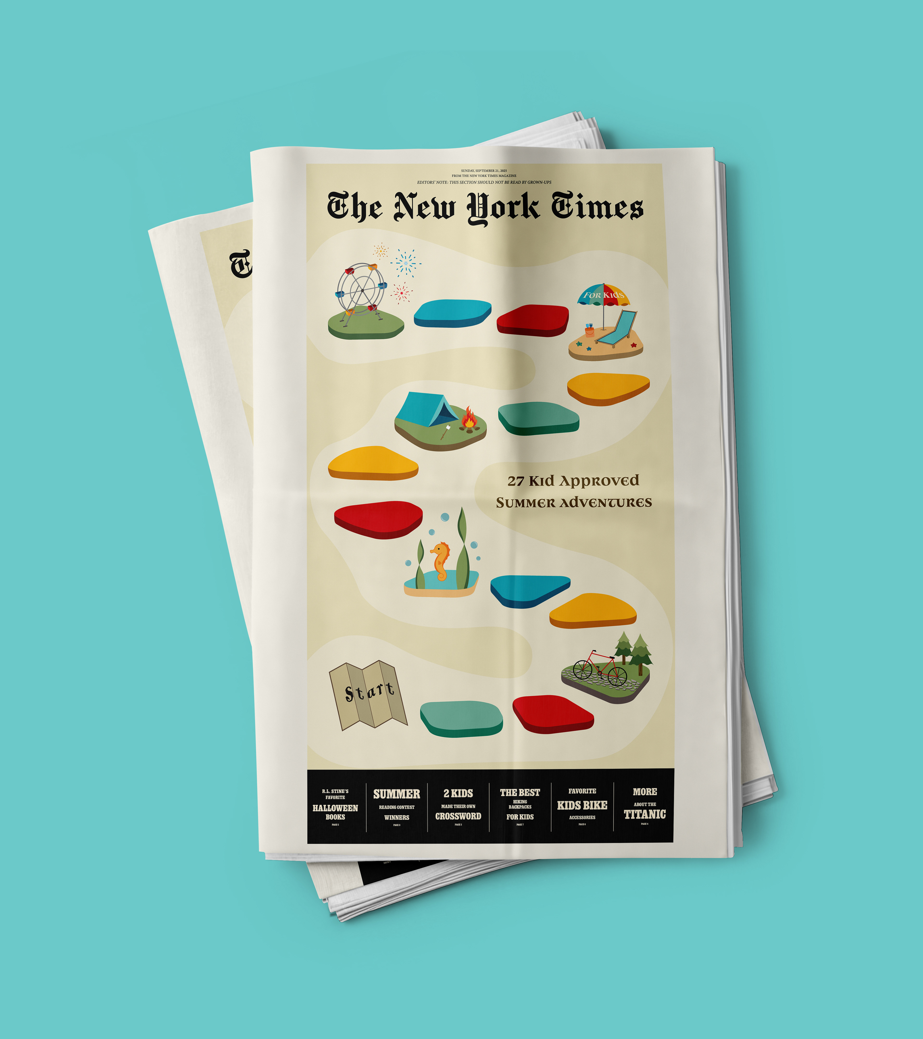 For this print-only concept, I reimagined The New York Times special print-only edition through the lens of The New York Times For Kids publication. While preserving familiar aspects of the original print format, I introduced a playful, adventure-inspired layout tailored to younger readers. Inspired by the article “27 Kid-Approved Summer Adventures” by Charley Locke, I transformed summer activities into a hybrid pirate-map–game-board design. Using tile pathways, aged textures, vibrant illustrations, and vintage typography, I created a print experience that encourages exploration and imagination. My print results in an experience that not only attracts young readers visually but also expands the possibilities of how a children’s newspaper can function and feel.
